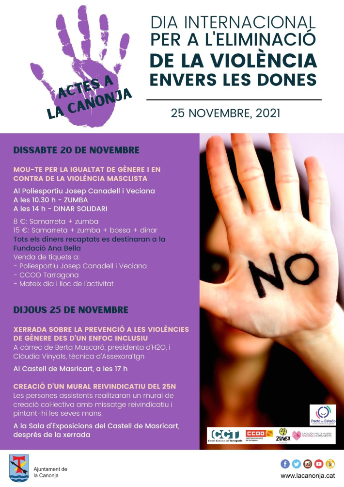 Amb motiu del Dia Internacional de l'Eliminació de la Violència contra les Dones, l'Ajuntament de la Canonja amb la col·laboració d'altres entitats ha organitzat activitats solidàries, informatives i reivindicatives. De la mateixa manera, l'Ajuntament se suma al manifest unitari del 25-N, consensuat entre el Govern de la Generalitat, la Federació de Municipis de Catalunya, l'Associació Catalana de Municipis, les diputacions de Barcelona, Tarragona, Girona i Lleida, l'Ajuntament de Barcelona i la Delegación del Gobierno en Catalunya renovant així el ferm compromís per erradicar les violències masclistes.